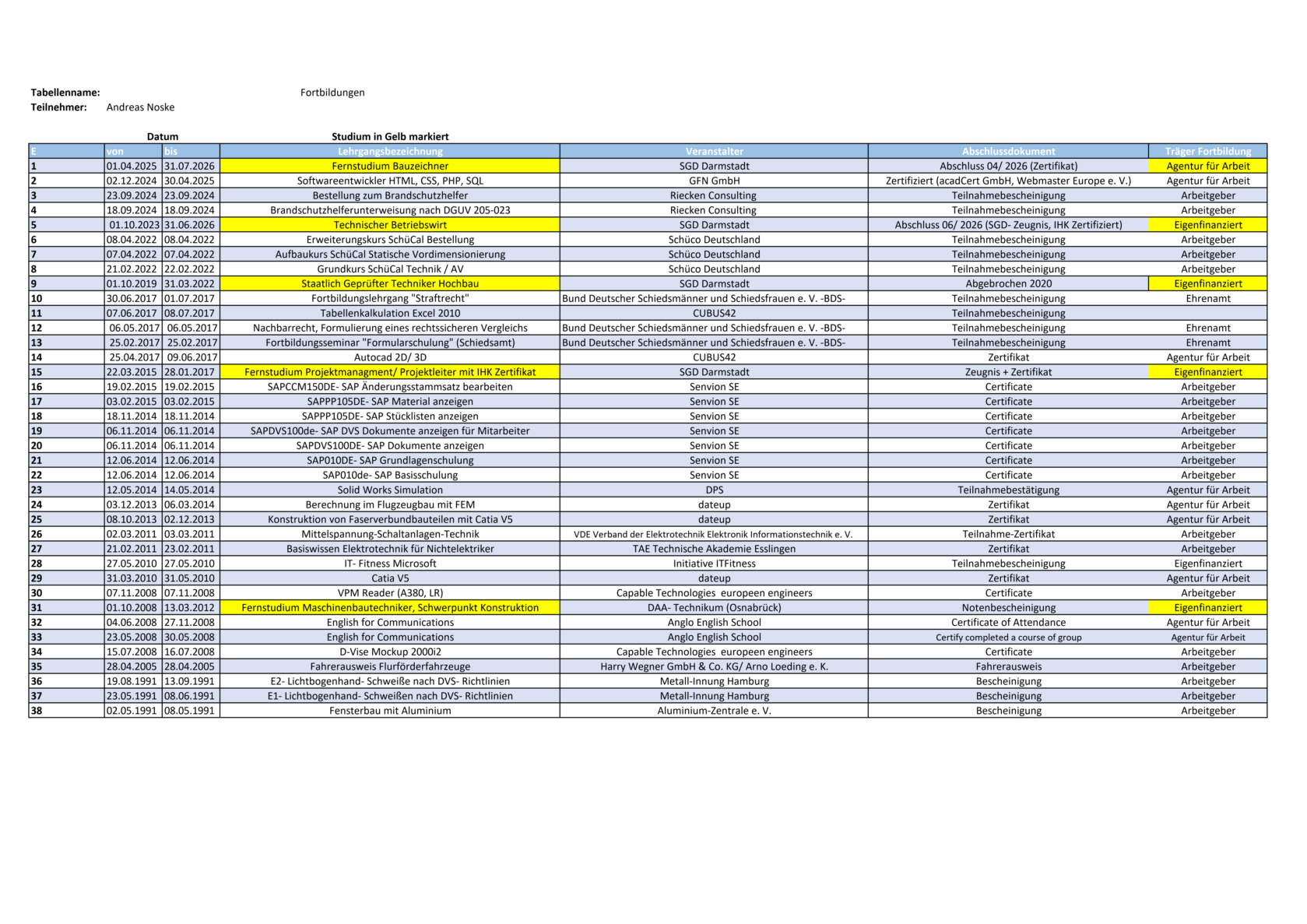 Ich habe unterschiedliche Studiengänge besucht und abgeschlossen, Teilnahmen an Weiterbildungen und Lehrgängen.